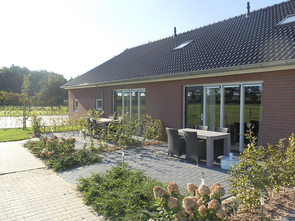 Vanuit de woonkamer heeft u vrij uitzicht over de weilanden en loopt u zo u eigen terras op met comfortabele tuinset.