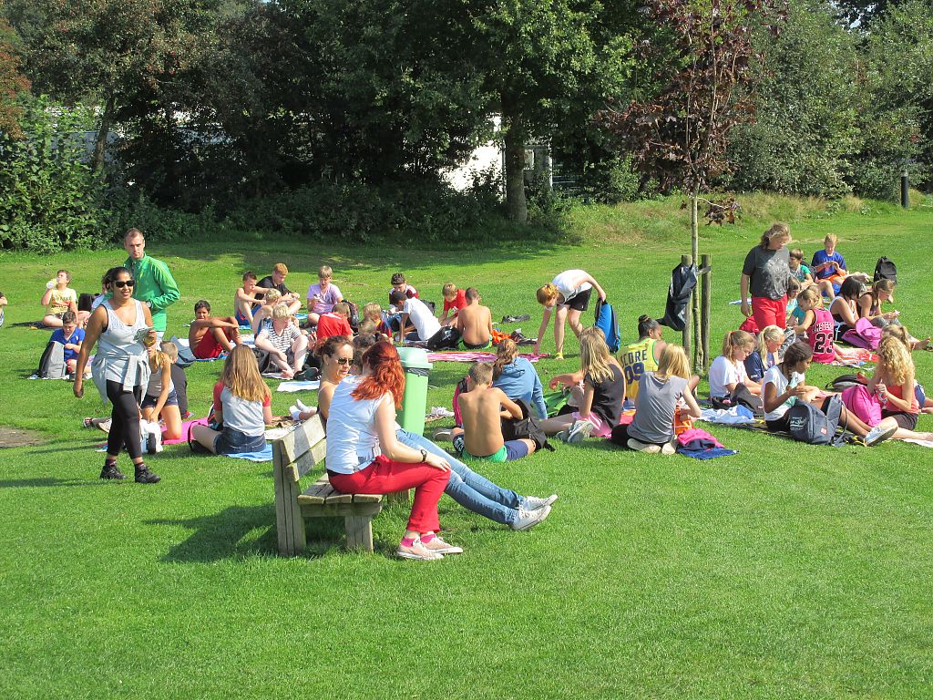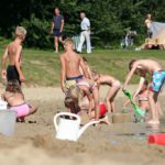 Sportveld met beachvolleybal, voetbal, speeltoestellen, tafeltennis en tennisbaan met kunstgras.