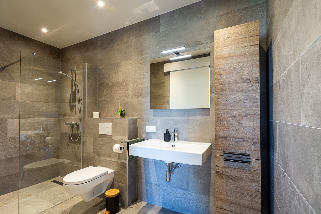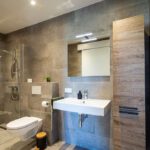 Beneden een eigen royale badkamer met handdoekenpakket, opbergkastje en föhn.