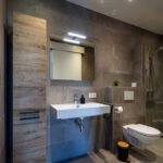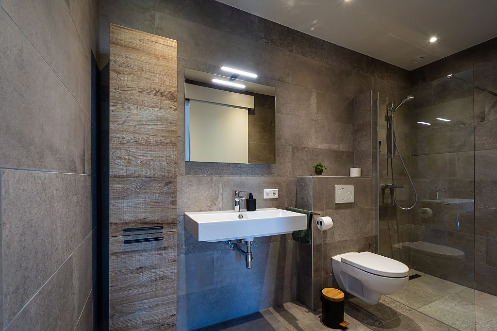 Beneden een eigen badkamer met handdoekenpakket, opbergkastje en föhn.