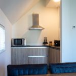 Verder beschikt de kamer over een moderne keuken met de benodigde kook- en bakpannen en een handdoekenpakket. De keuken is voorzien van een vaatwasser, waterkoker, Nespresso apparaat, koelkast, inductie kookplaat en combimagnetron.