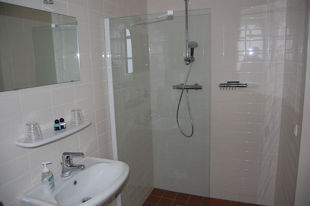 Badkamer met douche, wastafel en toilet