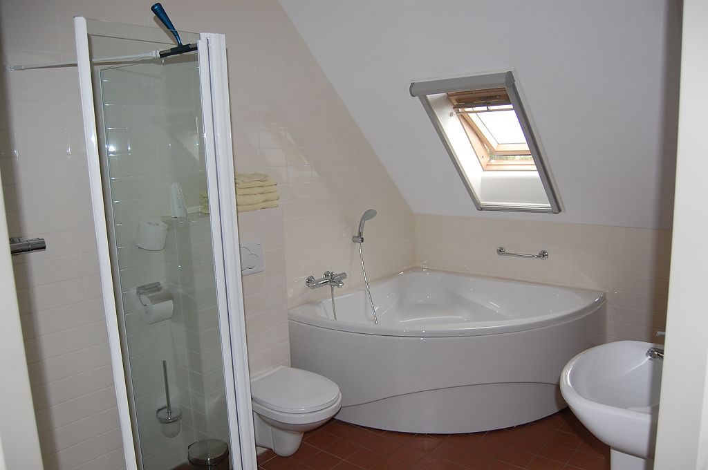 Badkamer met 2-persoonsbad, separate-douche, wastafel en toilet