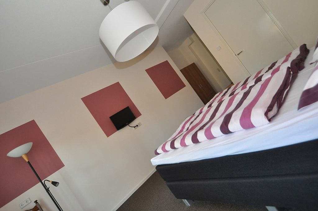 Er staat een boxspring bed van 2 * 90 bij 200 op de kamer.