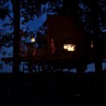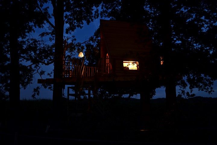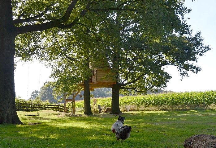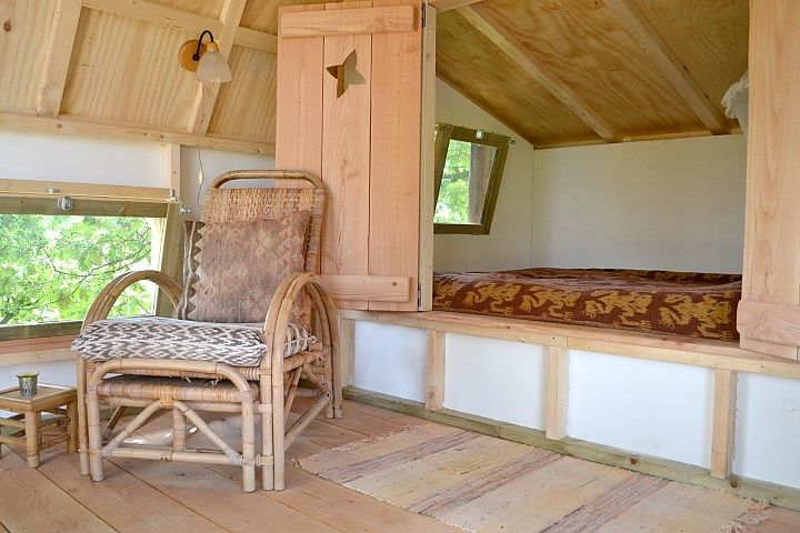 De boomhut-droomhut beschikt over een zitje, bedstede, mini-keukentje (voor koffie/thee) en terras op hoogte. De grootte is 7,5m2 + aparte bedstee 2,10×1,40. Het is geweldig om zo hoog te zitten en over alles uit te kijken.