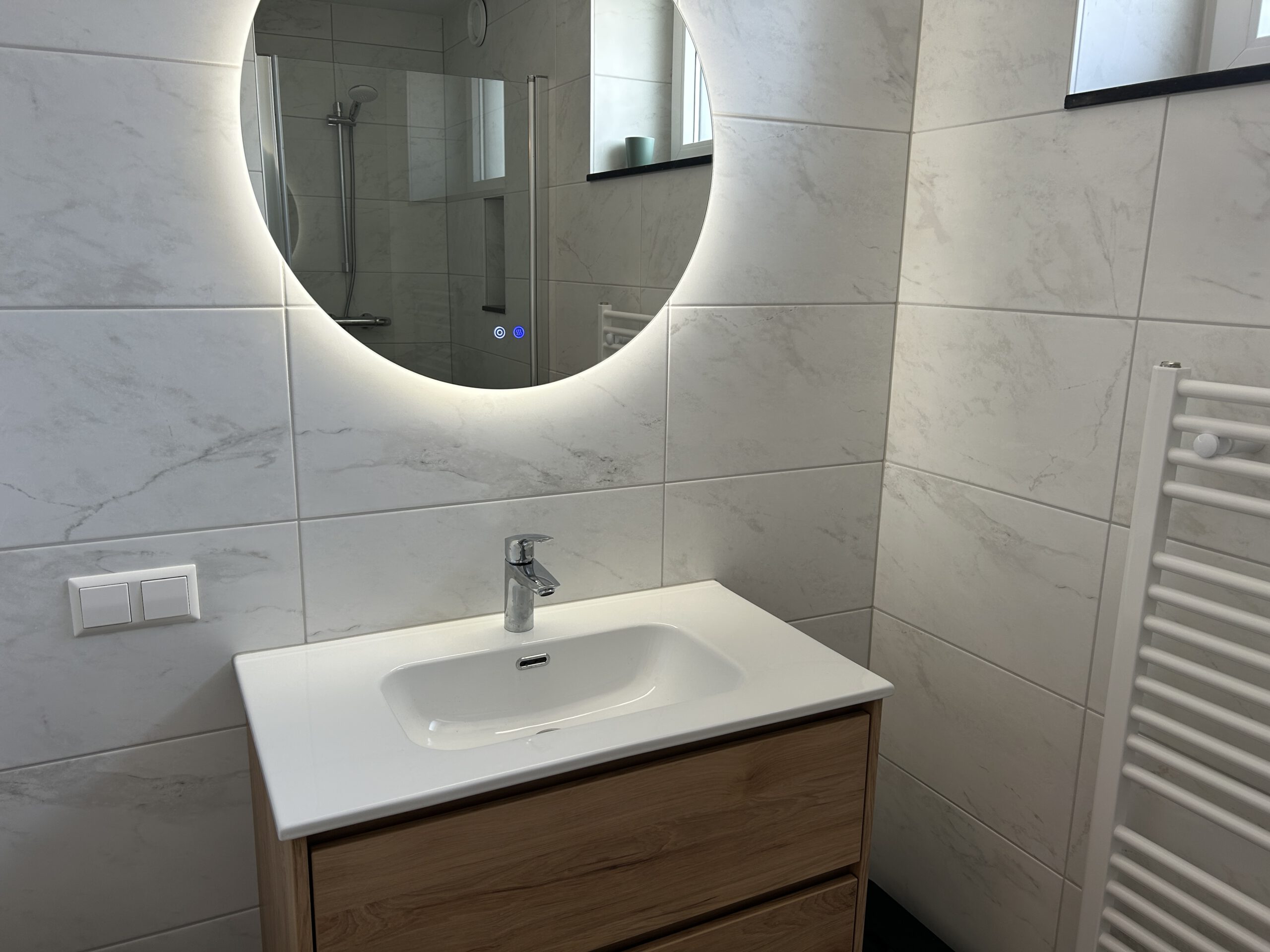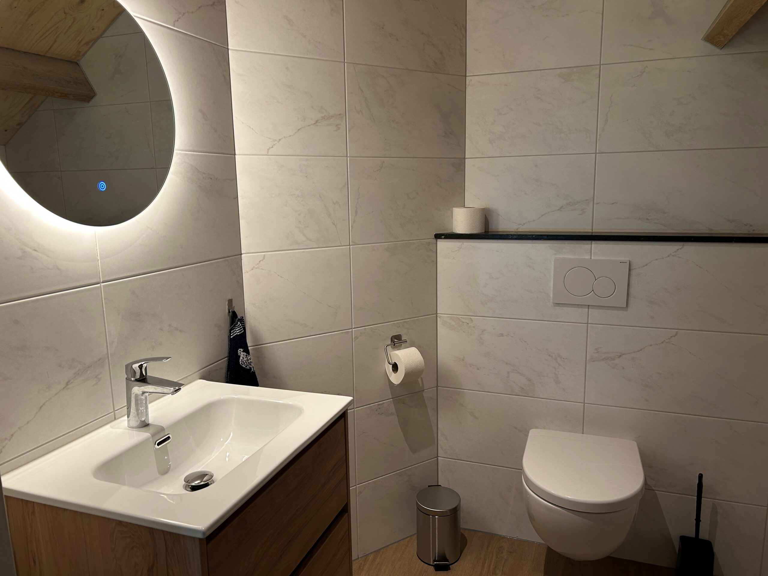 De woning is stijlvol en comfortabel ingericht. Op de begane grond vind je een ruime slaapkamer en een moderne badkamer, volledig gelijkvloers en voorzien van airconditioning. Op de verdieping bevindt zich een tweede slaapkamer met een eigen toilet en wastafel. Ideaal voor gezinnen of gasten die wat extra privacy willen.