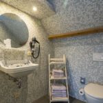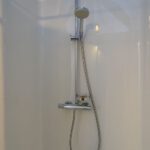 Er is een douche toilet lavabo frigo tv en zithoekje aanwezig