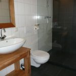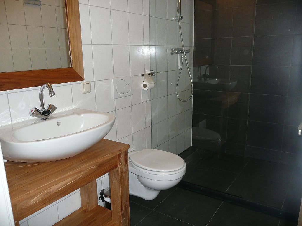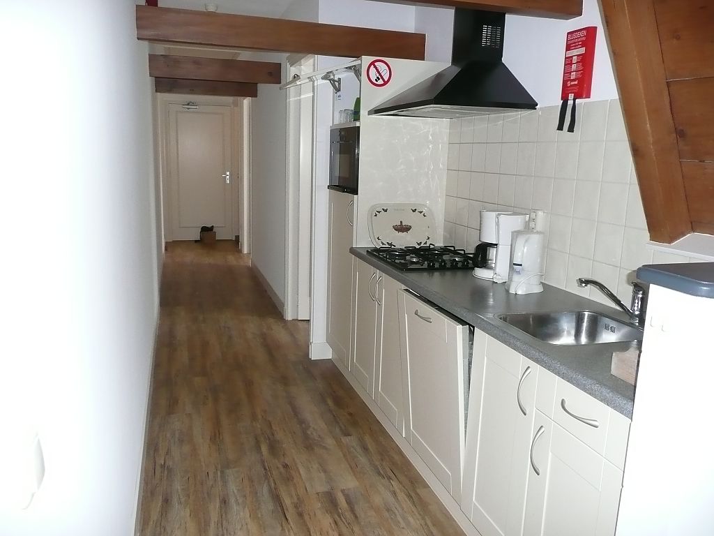 Schone douche/toilet, een ruime woonkamer met een open keuken die van alle gemakken is voorzien zoals magnetron, afwasmachine, koelkast met vriesvak.