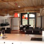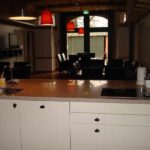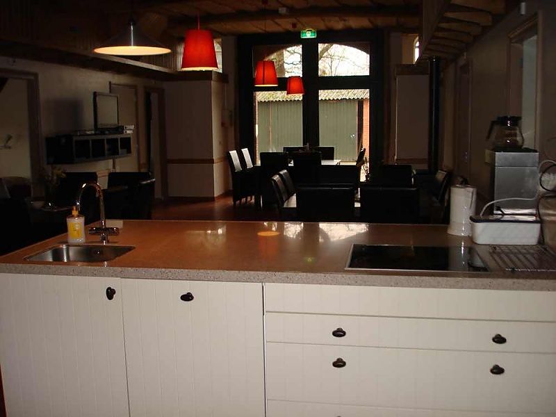 Beneden “op de deel” is nu een ruime, gezellige gemeenschappelijke woonkamer. Hier vindt u diverse zitjes, de houtkachel, een tv-hoek en een complete open keuken. Deze keuken voorziet in een keramische kookplaat, oven, magnetron, vaatwasser, waterkoker, koffiezetapparaat en ruim voldoende servies, bestek en andere kookbenodigdheden. U kunt hier zelf koken of mee gebracht eten opwarmen, maar als u kiest voor wat meer gemak kunt u ook eten halen of uiteten gaan in de directe omgeving van het Elsenerbroek.