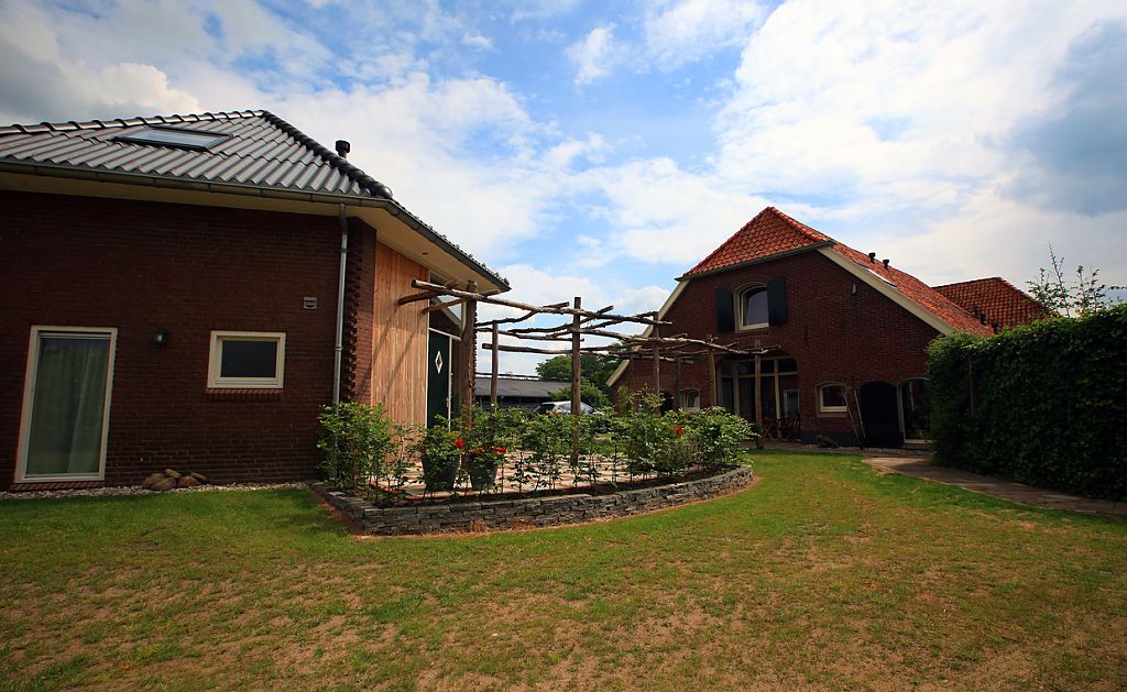 Het geheel ligt op een 3.000 m2 groot terrein en biedt voldoende privacy. De tuin van de boerderij is op een natuurlijke manier ontworpen, zodat de tuin enerzijds prettig is om te verblijven en anderzijds op gaat in het Achterhoekse landschap. Naast het huis bevinden zich een ruim buitenterras en verschillende kleine terrasjes. Aansluitend aan het grote terras is een overkapping met houtkachel, tafeltennistafel en dartbord. Verder is er een ruim speelveld met trampoline, zandbak, voetbaldoeltjes en speeltoestel.
